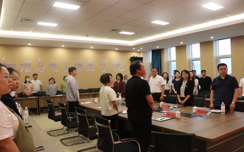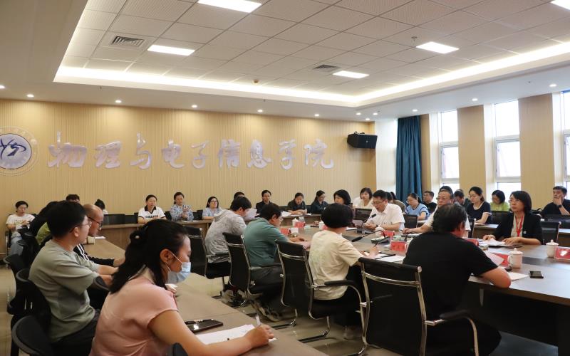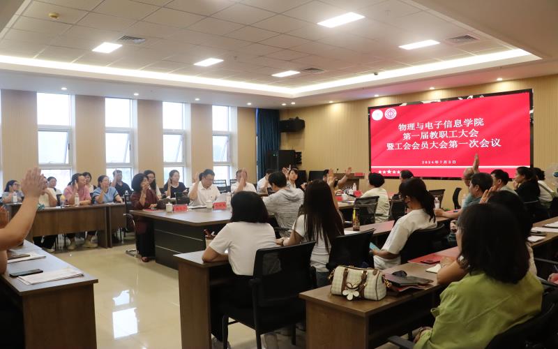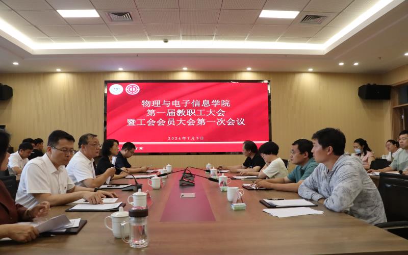 7月3日下午,物理与电子信息学院第一届教职工大会暨工会会员大会第一次会议在知行楼C605会议室召开,学院党委书记李喜军、院长李培芳、副院长周昆鹏、学院分工会主席韩元春以及学院全体教职工参会。会议由学院党委副书记马新军主持。