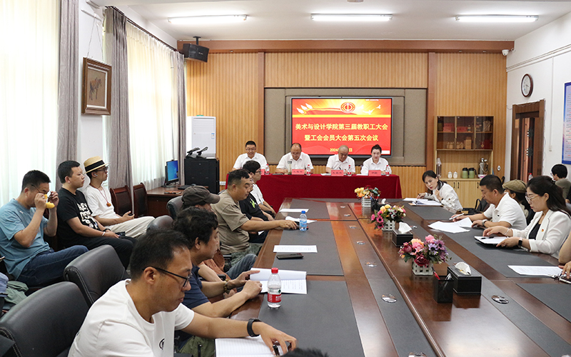 7月1日下午,美术与设计学院在逸夫楼一楼会议室召开第三届教职工大会暨工会会员大会第五次会议。学院党委书记王志辉、院长王永波、副院长于淼及全体教职工参加会议。会议由学院党委副书记杨文军主持。